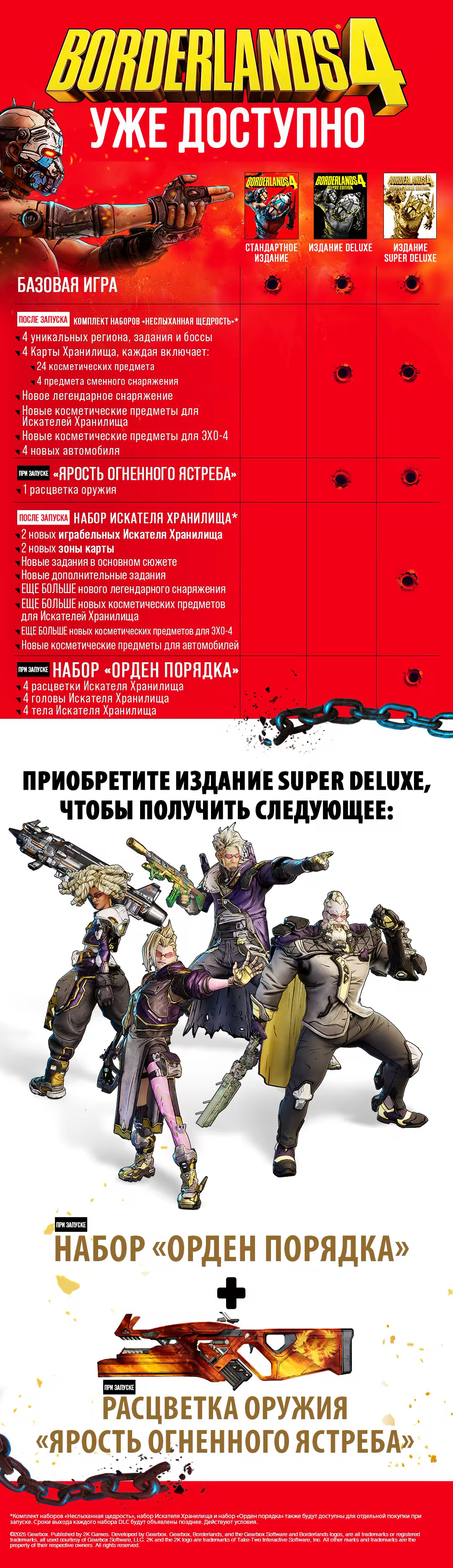 *Набор Borderlands 4 «Неслыханная щедрость» состоит из 4 отдельных наборов DLC, доступных после запуска: набор «Неслыханная щедрость» 2, 3, 4 и 5. Комплект наборов «Неслыханная щедрость» включен в издания Borderlands 4 Deluxe и Super Deluxe. Комплект наборов «Неслыханная щедрость» и отдельные пакеты DLC, входящие в комплект, также будут доступны для отдельной покупки при запуске (требуется основная игра). Точные сроки выхода каждого набора DLC будут объявлены позднее и могут быть изменены. Действуют условия.