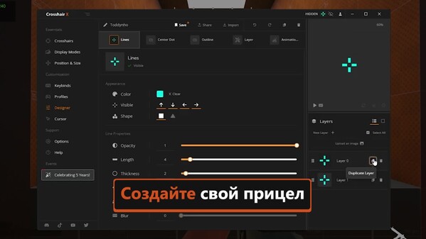 - Дизайнер: простая кастомизация при помощи ползунков, чтобы настроить все части прицела