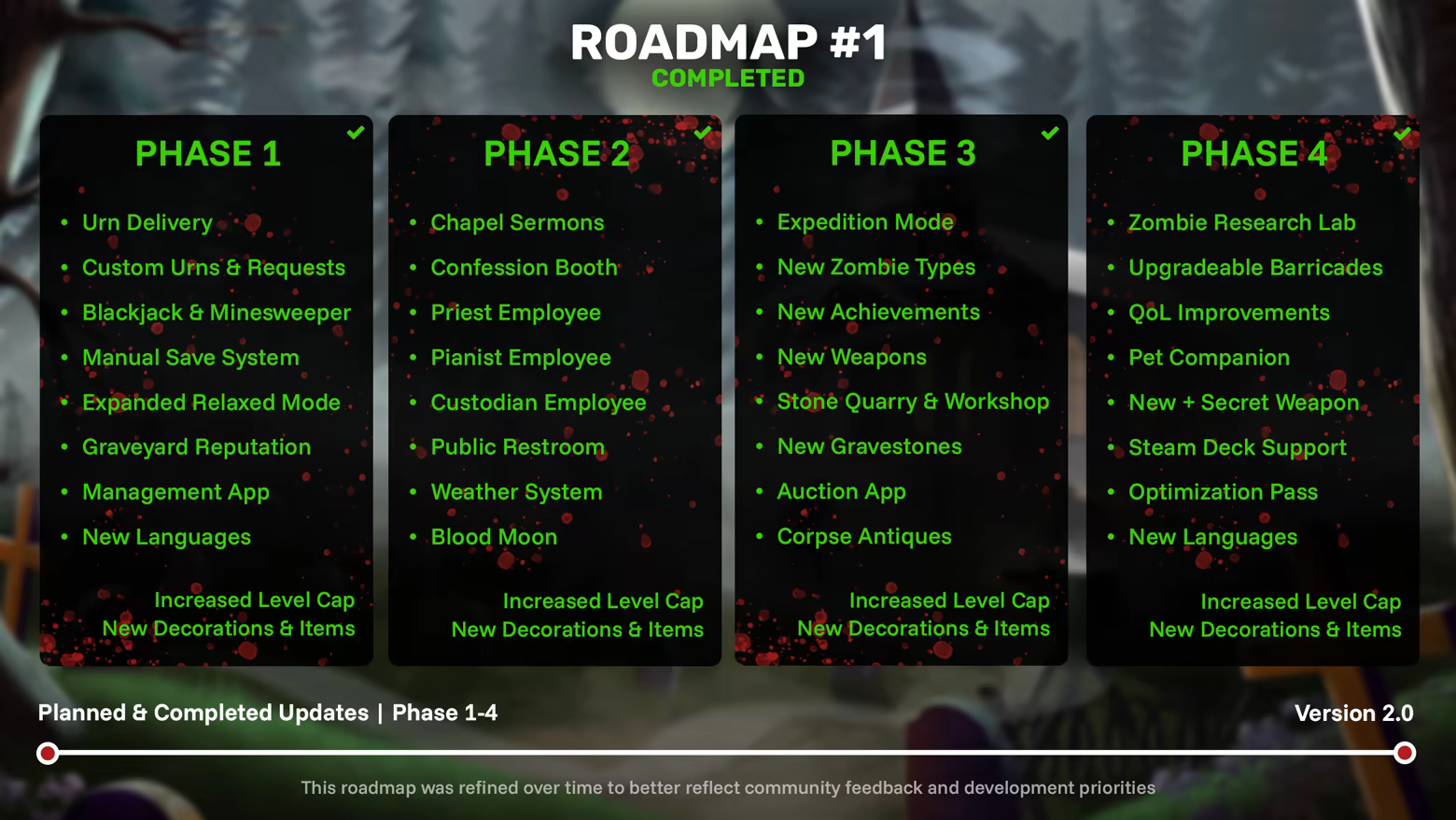 После обработки тел, посетители возвращаются, чтобы навестить своих близких. Ваша обязанность - поддерживать могилы в порядке, предоставляя свежие цветы и создавая гостеприимную обстановку. Каждый визит награждает вас ценными бонусами, которые помогут вашему бизнесу процветать.Посетители также могут заглянуть в Часовню, чтобы отдохнуть, и заглянуть в Сувенирный магазин за небольшими памятными вещами, такими как свечи и благовония. Чистое и украшенное кладбище способствует большей щедрости при пожертвованиях!